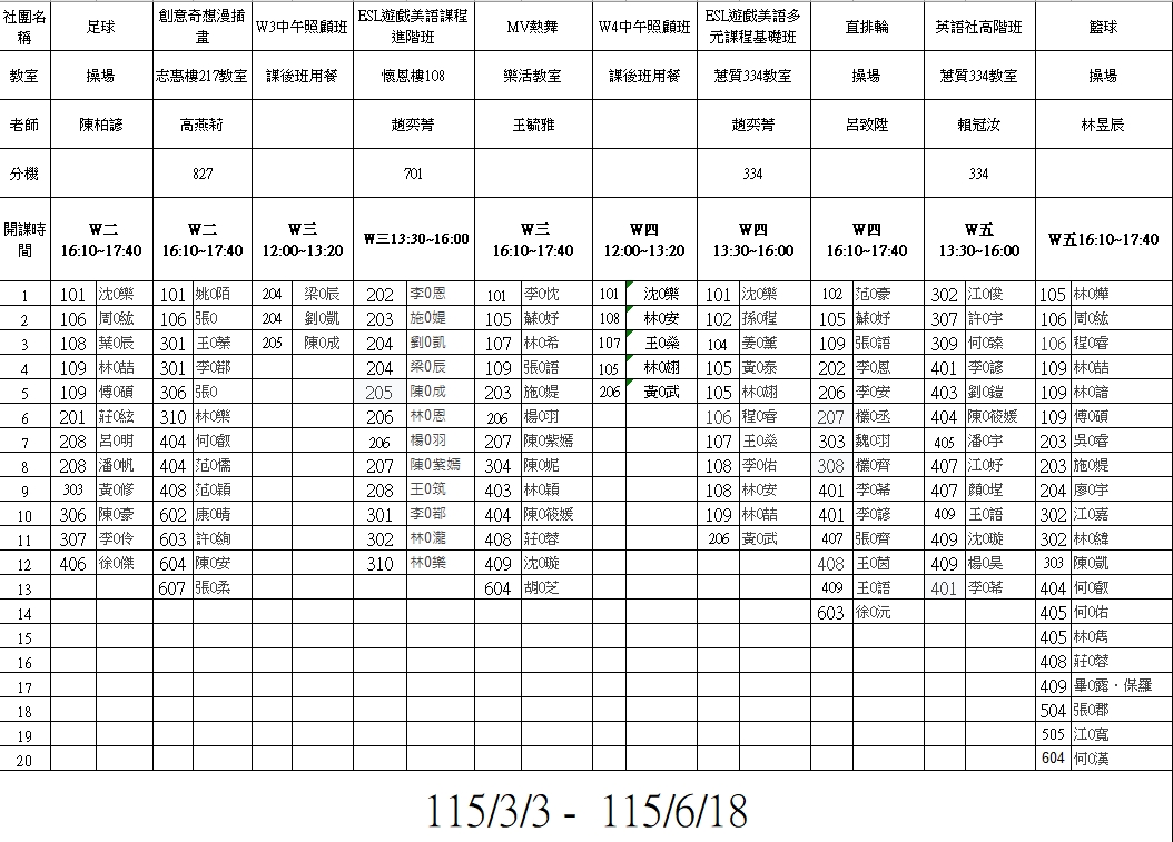 114-2社團課程上課時間115/3/3 - 115/6/18