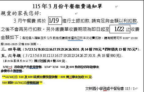 3月份繳費扣款將於1/19於土銀帳戶扣款,繳費單收費至1/22,請留意繳費時間。