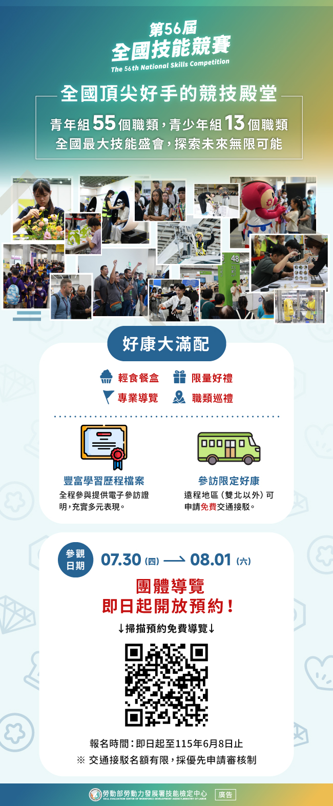 有關勞動部勞動力發展署技能檢定中心辦理115年度「第56屆全國技能競賽」,邀請各校可以納入暑假相關活動或鼓勵措施(如鼓勵學生自行前往,納入暑期自主學習之一)。另倘貴校設有「職業試探與體驗中心」、「自造教育及科技輔導中心」及規劃辦理暑假「國中小職業試探育樂營」等暑期活動期間規劃外部參訪,請師生納入規劃並踴躍報名參訪事宜,詳如說明,請查照。