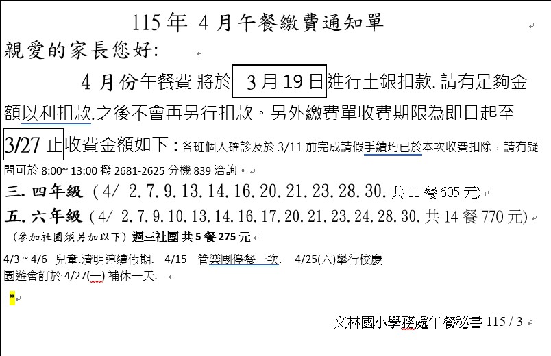 中高年級四月份午餐繳費通知,如附件